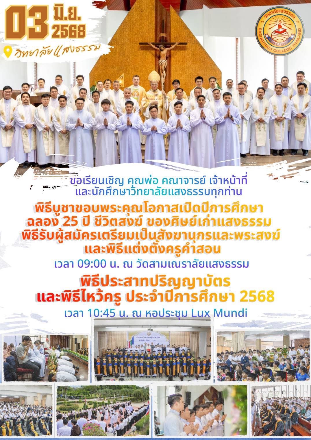 ขอเชิญร่วมพิธีบูชาขอบพระคุณโอกาสเปิดปีการศึกษา ฉลอง 25 ปี ชีวิตสงฆ์ของศิษย์เก่าแสงธรรม พิธีประสาทปริญญาบัตร ประจำปีการศึกษา 2566 และพิธีไหว้ครู ประจำปีการศึกษา 2568 โดย พระอัครสังฆราช ฟรังซิสเซเวียร์ วีระ อาภรณ์รัตน์ ในวันอังคารที่ 3 มิถุนายน พ.ศ. 2568 ณ วิทยาลัยแสงธรรม