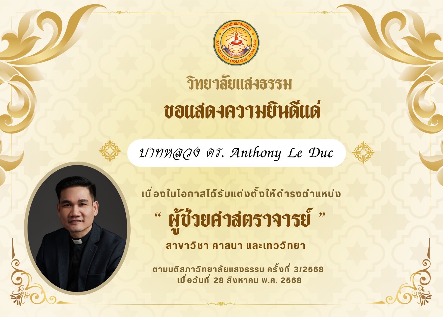 วิทยาลัยแสงธรรมขอแสดงความยินดี แด่ บาทหลวง ดร. Anthony Le Duc อาจารย์ประจำสาขาเทววิทยาจริยธรรม คณะศาสนศาสตร์ ที่ได้รับการอนุมัติจากคณะกรรมการสภาวิทยาลัยแสงธรรม ให้แต่งตั้งตำแหน่ง “ผู้ช่วยศาสตราจารย์” ในสาขาวิชา ศาสนา และเทววิทยา ในการประชุมครั้งที่ 3/2568 เมื่อ วันพฤหัสบดีที่ 28 สิงหาคม พ.ศ.2568