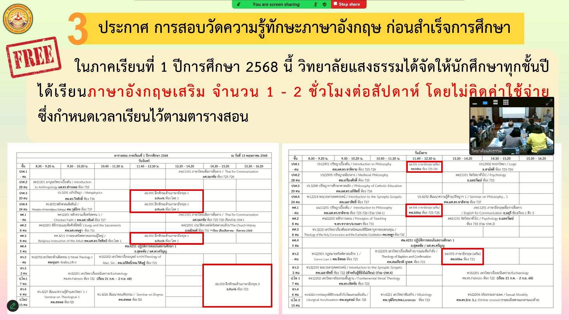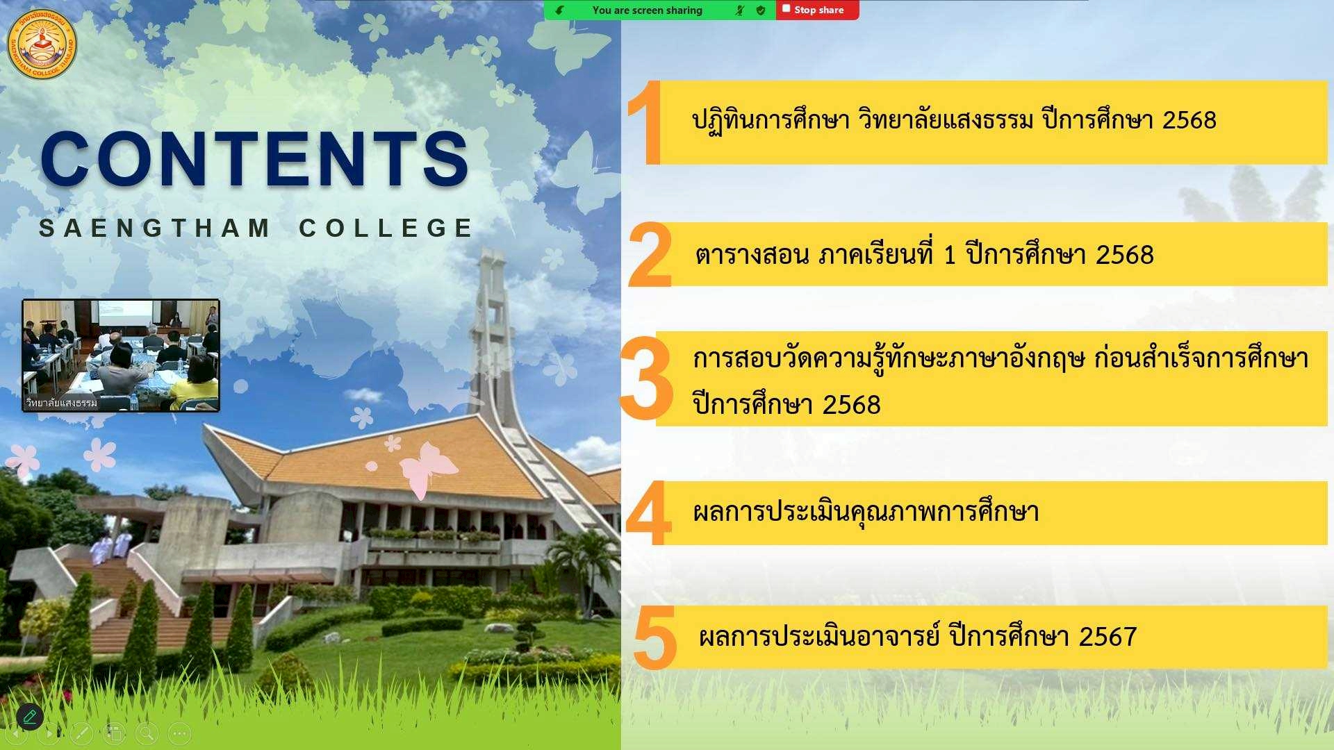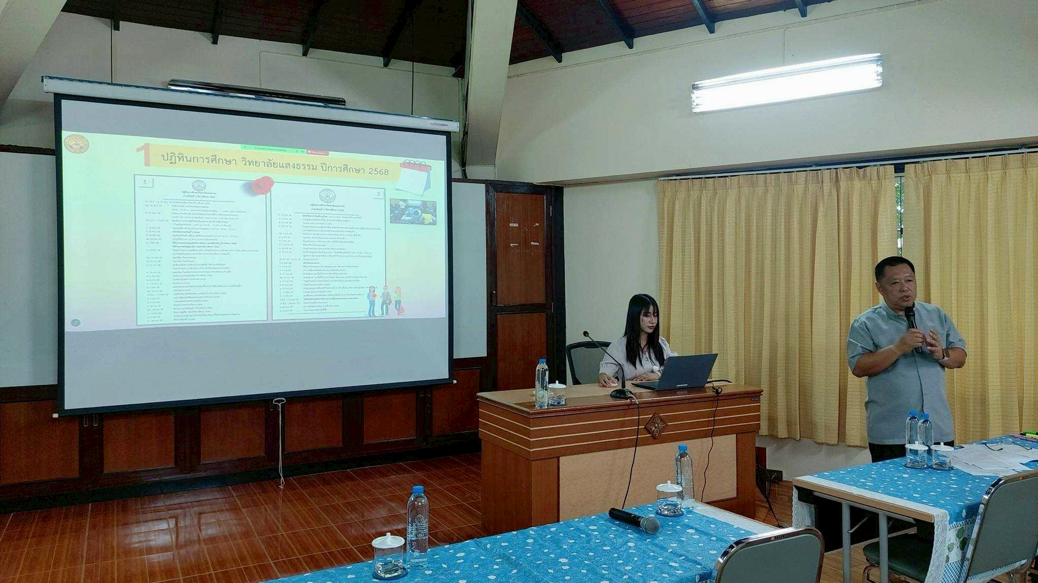ผู้เข้าร่วมการประชุมรับฟังการบรรยายแบ่งปันหัวข้อ "ก้าวสู่การเรียนรู้ด้วย Active Learning เพื่อรับมือกับความ ท้าทายของการศึกษาในศตวรรษที่ 21" โดย รองศาสตราจารย์ ดร.มารุต พัฒผล และหัวข้อ "การจัดการเรียนการสอนแบบ Active Learning และการดำเนินงานของวิทยาลัยแสงธรรม ปีการศึกษา 2568” ต่อด้วยการซักถาม/ข้อเสนอแนะ เพื่อพัฒนาวิทยาลัยแสงธรรม โดย บาทหลวง ธีรพล กอบวิทยากุล อธิการบดี และภาวนาปิดการประชุมโดย บาทหลวง ผศ.เชษฐา ไชยเดช อธิการสถาบันแสงธรรม การประชุมในครั้งนี้มีผู้บริหาร คณาจารย์ อธิการบ้านอบรม (ผู้ปกครองนักศึกษา) และเจ้าหน้าที่ จำนวนทั้งหมด 39 คน เข้าร่วมประชุมในรูปแบบ Onsite และ Online